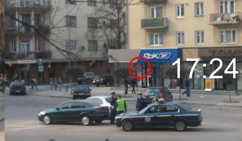 На фото патруль ДАІ на вулиці Незалежності у складі чотирьох чоловік не помітив автомобіль, що на відстані 10 метрів припаркувався з порушенням ПДР. Водій чорної "дев'ятки" проігнорував вимогу знаку "Зупинку заборонено".
