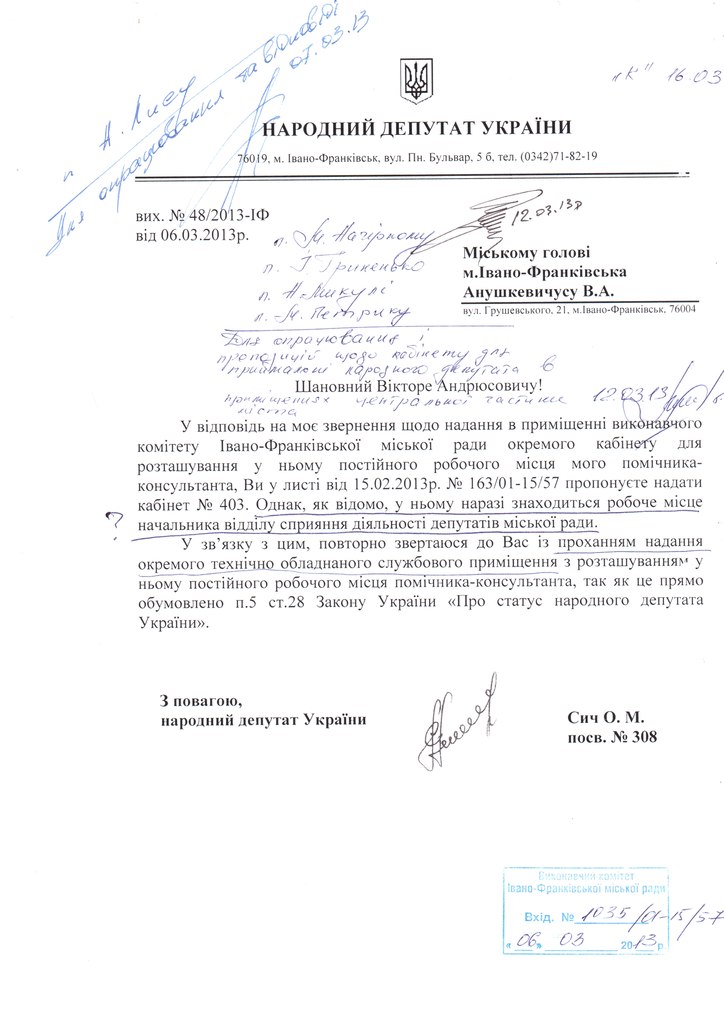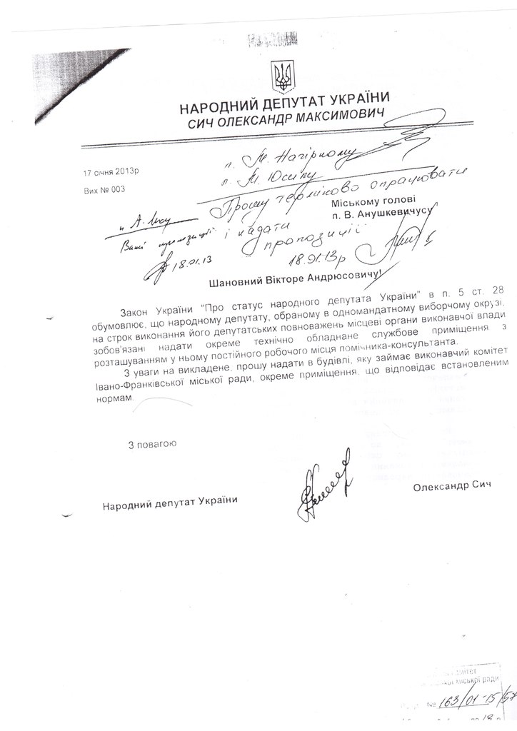 Прес-служба народного депутата Олександра Сича заявляє, що Сич позитивної відповіді на свої звернення так і не отримав. «Спочатку перший заступник міського голови м. Івано-Франківська Зіновій Фітель проінформував про відсутність міського голови на робочому місці й про те, що винятково міський голова Віктор Анушкевичус може прийняти рішення з цього питання. Згодом сам міський голова надіслав відповідь на звернення народного депутата, в якій запропонував приміщення, що вже зайняте іншим службовцем», - йдеться у заяві прес-служби, що майже відповідає дійсності.