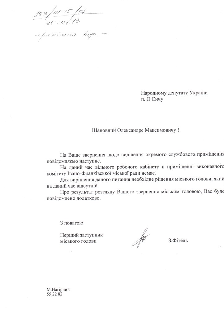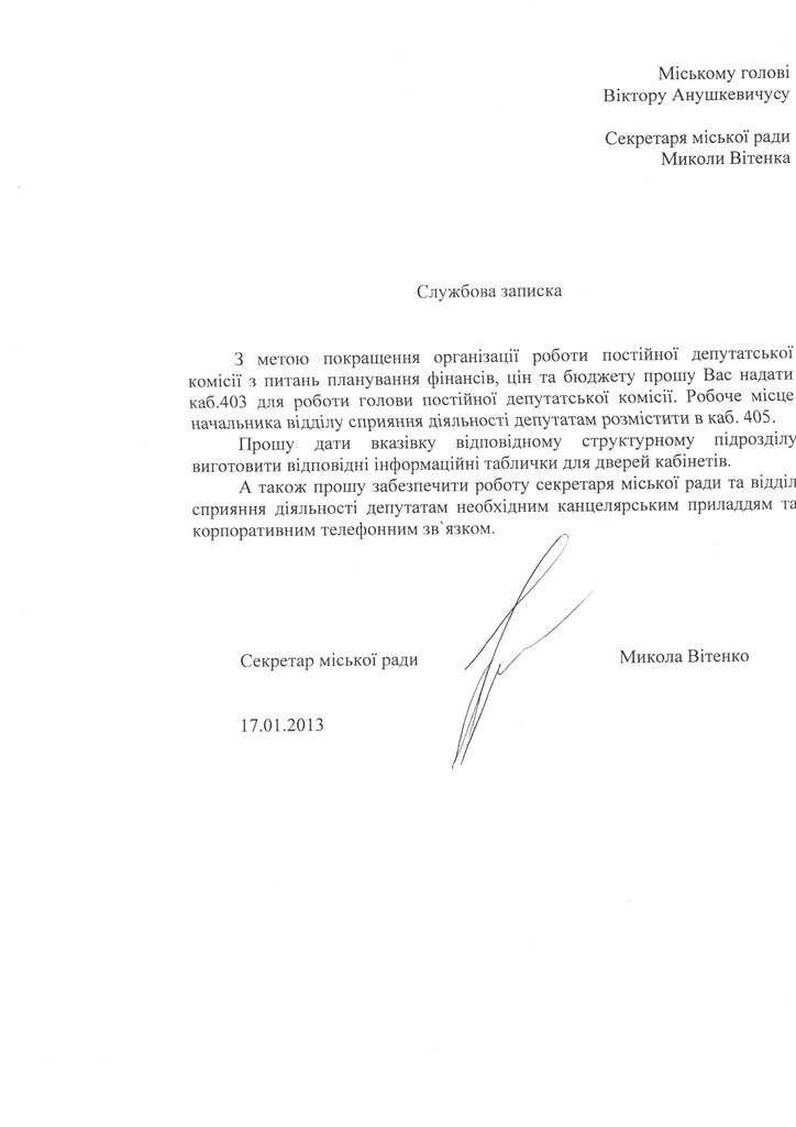 Тож, згідно нижче поданого документу, 17 січня Олександр Сич звернувся до міського голови з проханням у будівлі, яке займає виконавчий комітет, надати йому приміщення для помічника.