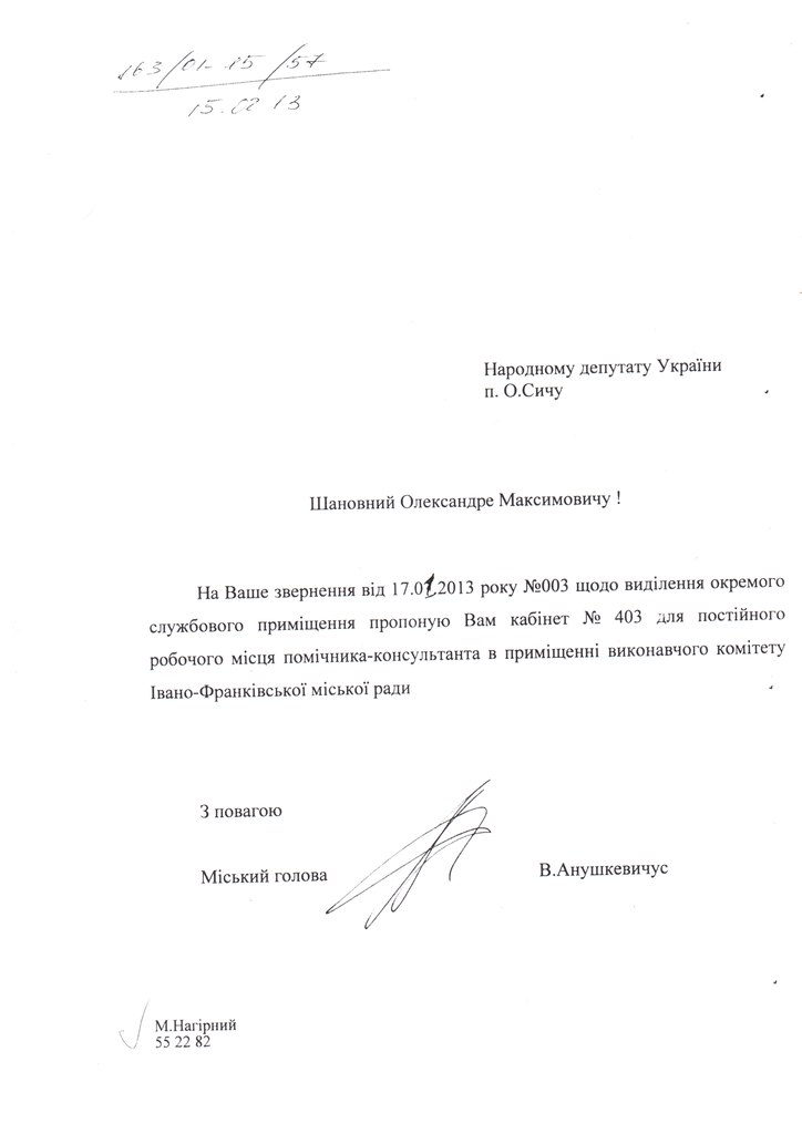 Невдовзі міський голова Віктор Анушкевичус таки повернувся із 2-охтижневого відрядження-відпустки. І, згідно звернення Сича, 15 лютого запропонував кабінет №403 для постійного робочого місця помічника-консультанта нардепа.