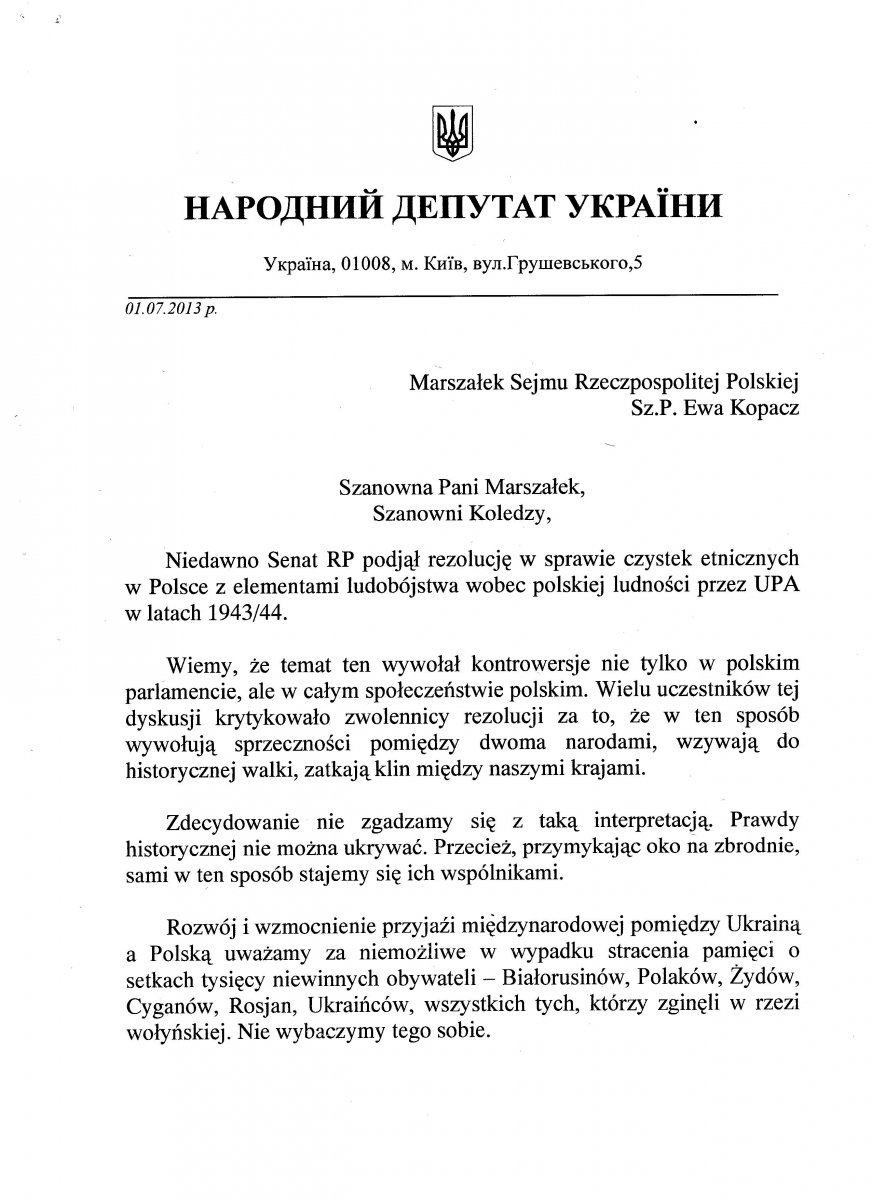 "Просимо вас, депутатів Сейму Республіки Польща, підтримати рішення сенату, визнати Волинську різанину ОУН-УПА геноцидом щодо польського населення і засудити злочинні діяння українських націоналістів", - наголошується в документі. На переконання нардепів, які підписалися під листом, різна трактовка Волинського злочину "забиває клин між двома країнами".