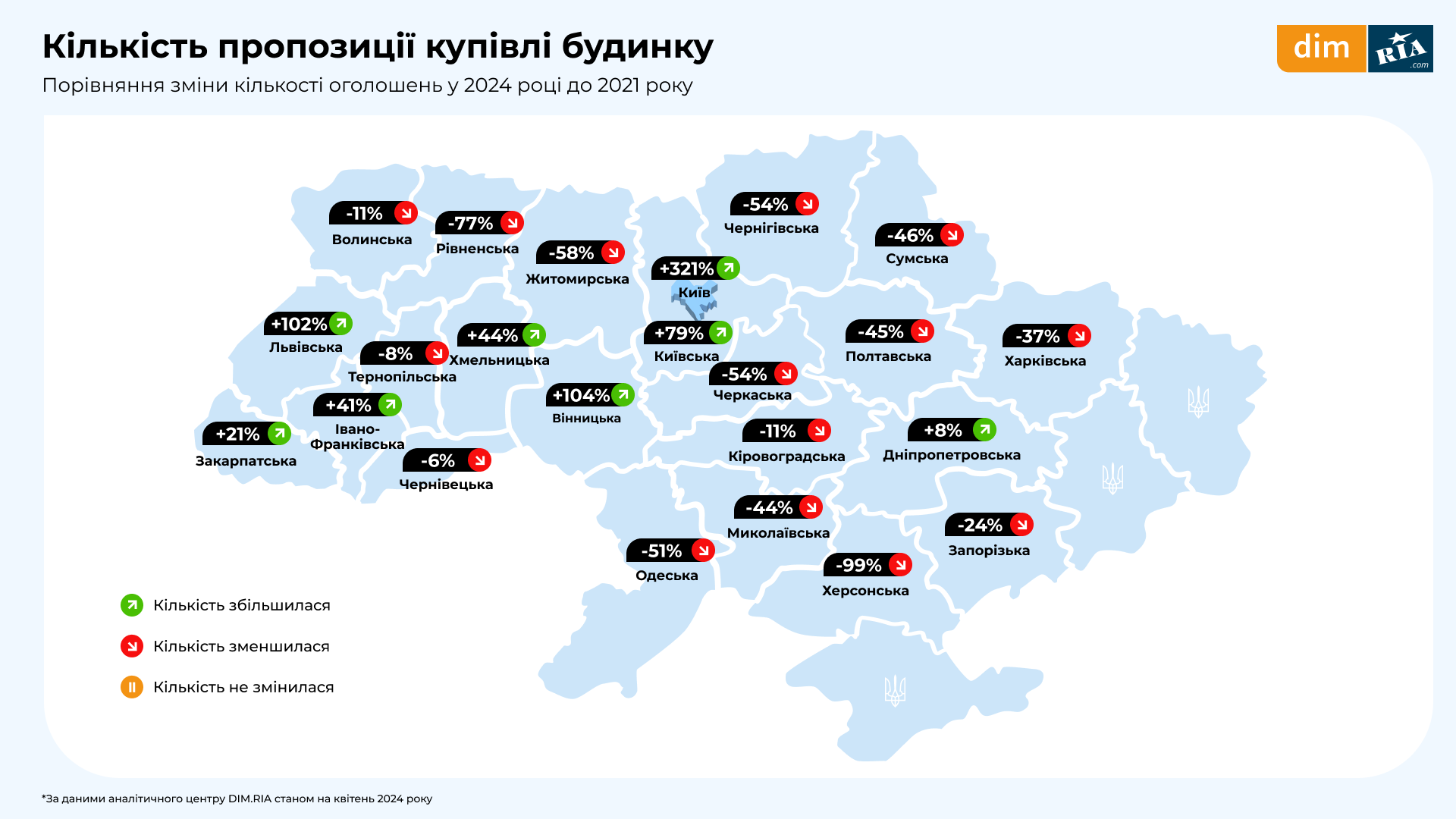 Так, як свідчать дані українського маркетплейса Dіm.Ria, дослідження пропозиції будинків у 2024 році до 2021 році показує значне зростання кількості оголошень на заході та падіння — на півдні, пише Фіртка.