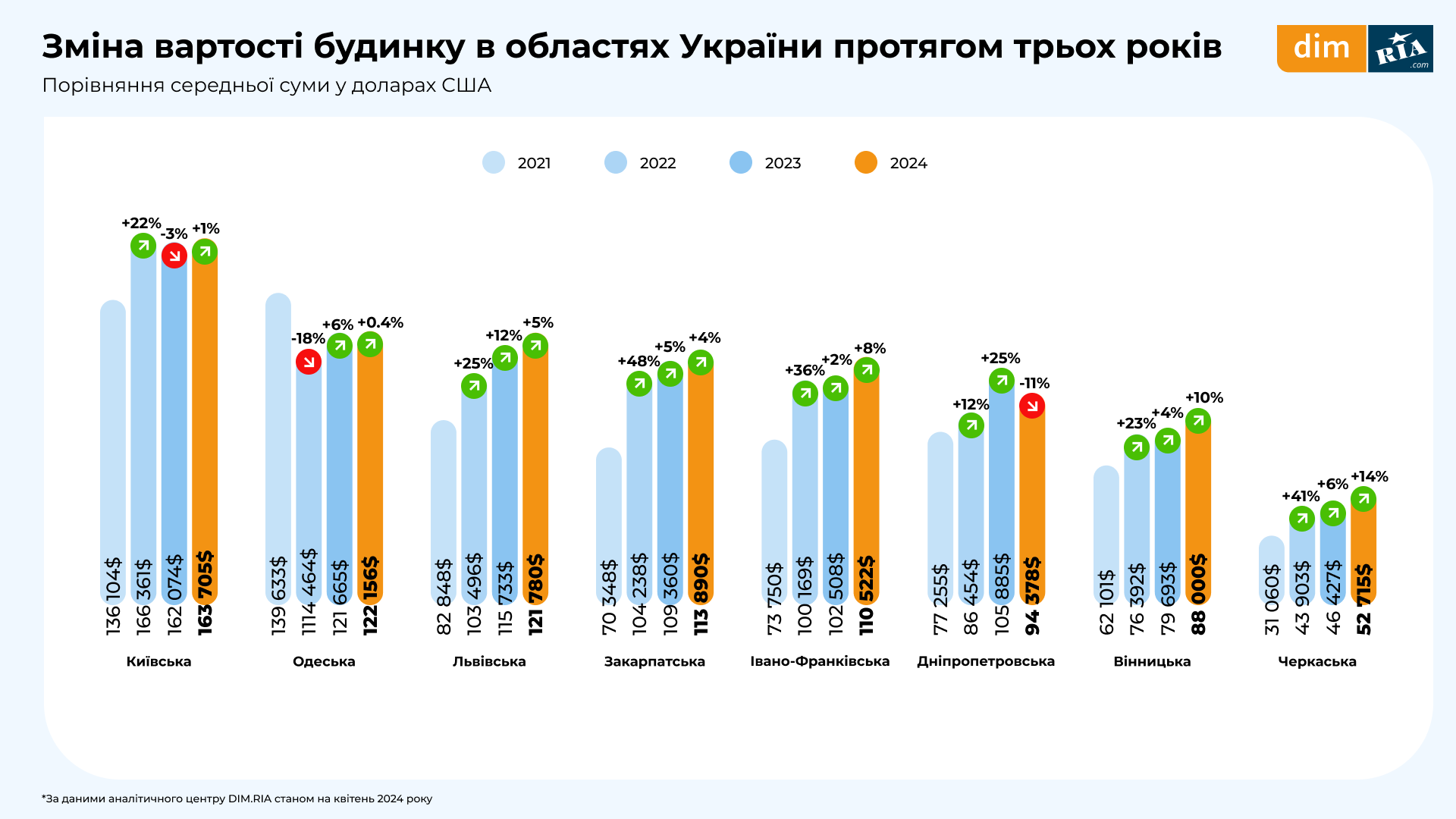 "Таким чином середня ціна будинку у Київській області складає 163 705 доларів США, в Одеській області — 122 156 доларів США.
