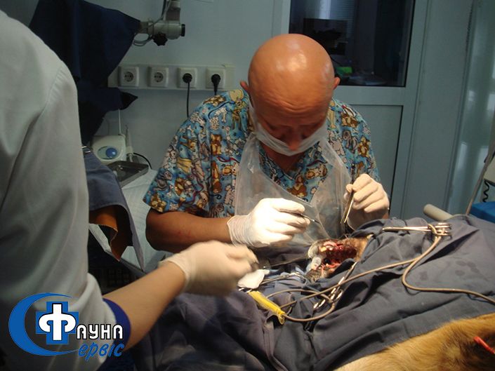 Завдання лікарів ветеринарного госпіталю полягала у відновленні цілісності носових пазух, забезпеченні можливості нормального харчування з подальшим відновленням зубного ряду (половина зубів вибита кулею) шляхом штифтовий імплантації зубних коронок.