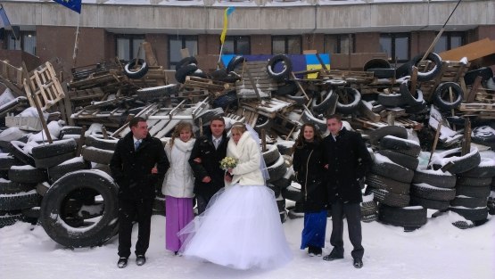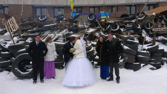 У суботу, 25 січня, до захопленої франківцями облдержадміністрації приїхали молодята. У морозний день молодята прийшли сфотографуватись до барикад під Білим будинком.