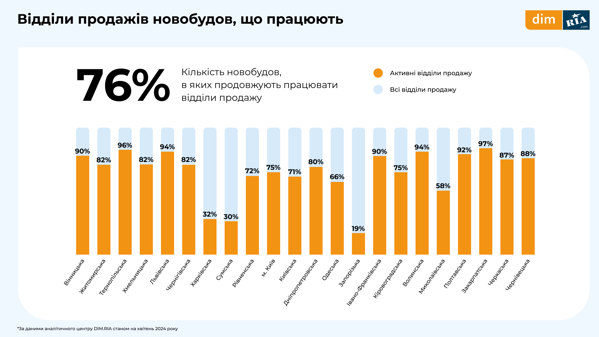 Найвищий показник кількості активних відділів продажу зафіксовано у Закарпатській області — 97%. Найбільша частка готових новобудов від усієї кількості у Київській області — 30%.