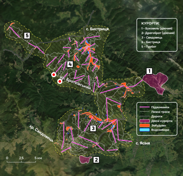 План був масштабний — понад 25 тисяч відпочивальників одночасно, понад двісті кілометрів трас, десятки підйомників. Паралельно в регіоні просувають давній мегапроєкт «Свидовець», розрахований на 28 тисяч туристів та понад 700 гектарів інфраструктури.