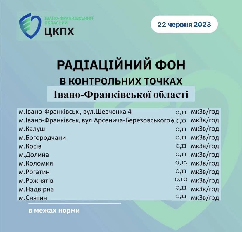 Станом на сьогодні, 22 червня, показник радіаційного фону в Івано-Франківській області становить від 0,10 до 0,12 мкЗв/год.