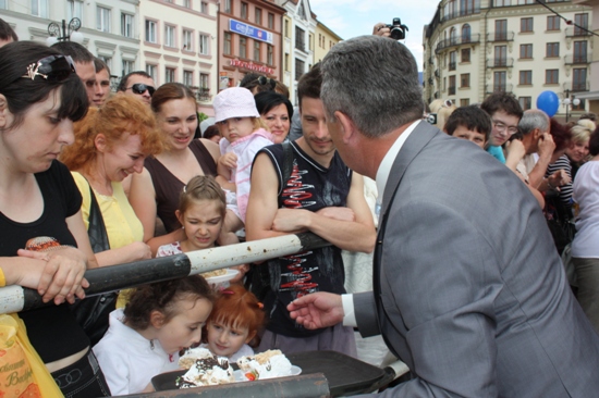 Привітали франківців з ювілеєм рідного міста і кондитери. Вони виготовили 12-ти метровий торт, яким пригощали усіх гостей дійства. Перші солодкі порції, традиційно, роздав міський голова Віктор Анушкевичус.