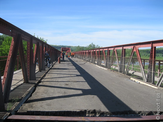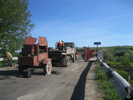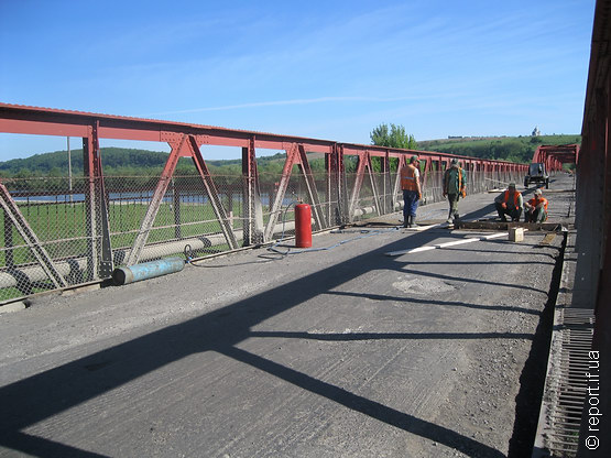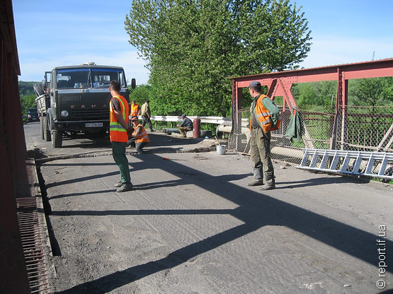 Служба автомобільний доріг області почала ремонт мосту через Дністер на трасі Івано-Франківськ – Тернопіль. Міст перекритий. Працівники облавтодору взялися за шви.