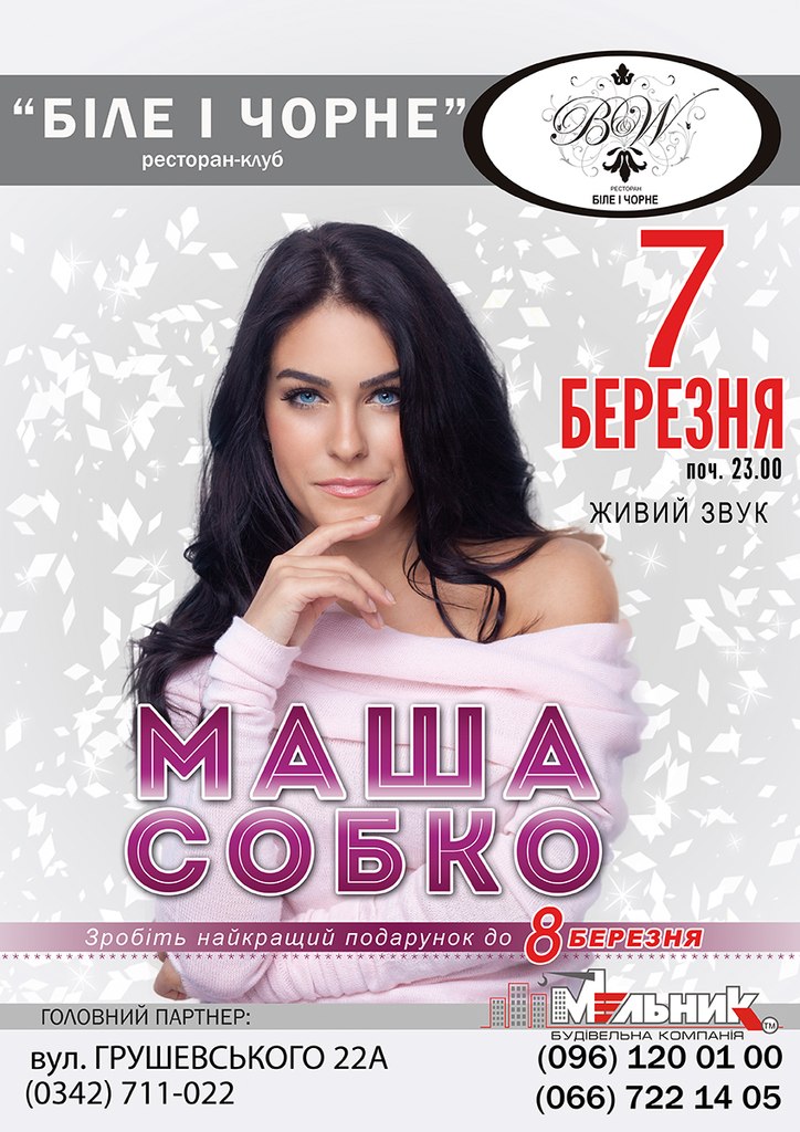 7 березня ресторан-клуб "Біле і Чорне", презентує концерт найталановитішої молодої зірки України Маши Собко. Подаруй незабутній вечір близькій людині на свято 8 березня.