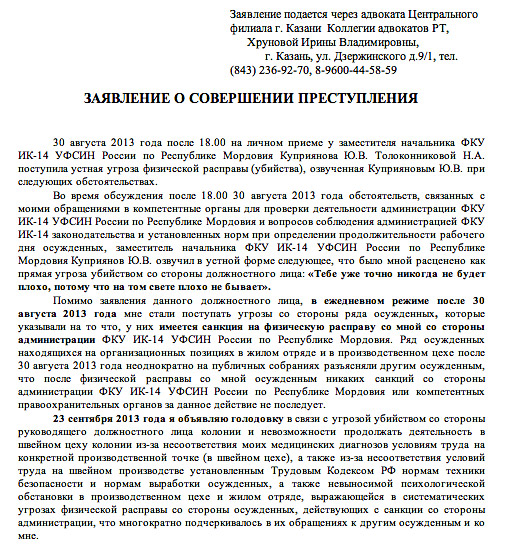 Утром 23 сентября участница Pussy Riot Надежда Толоконникова, отбывающая наказание в ИК-14 (поселок Парца, Мордовия), заявила о том, что начинает голодовку и отказывается от работы в швейном цехе колонии – в связи с массовым нарушением прав осужденных женщин на производстве. Одновременно Толоконникова подала обращение в Следственный комитет по поводу того, что ей угрожает убийством заместитель начальника колонии. "Лента.ру" публикует письмо Надежды Толоконниковой, в котором она объясняет, почему вступила в открытое противостояние с руководством исправительного учреждения: