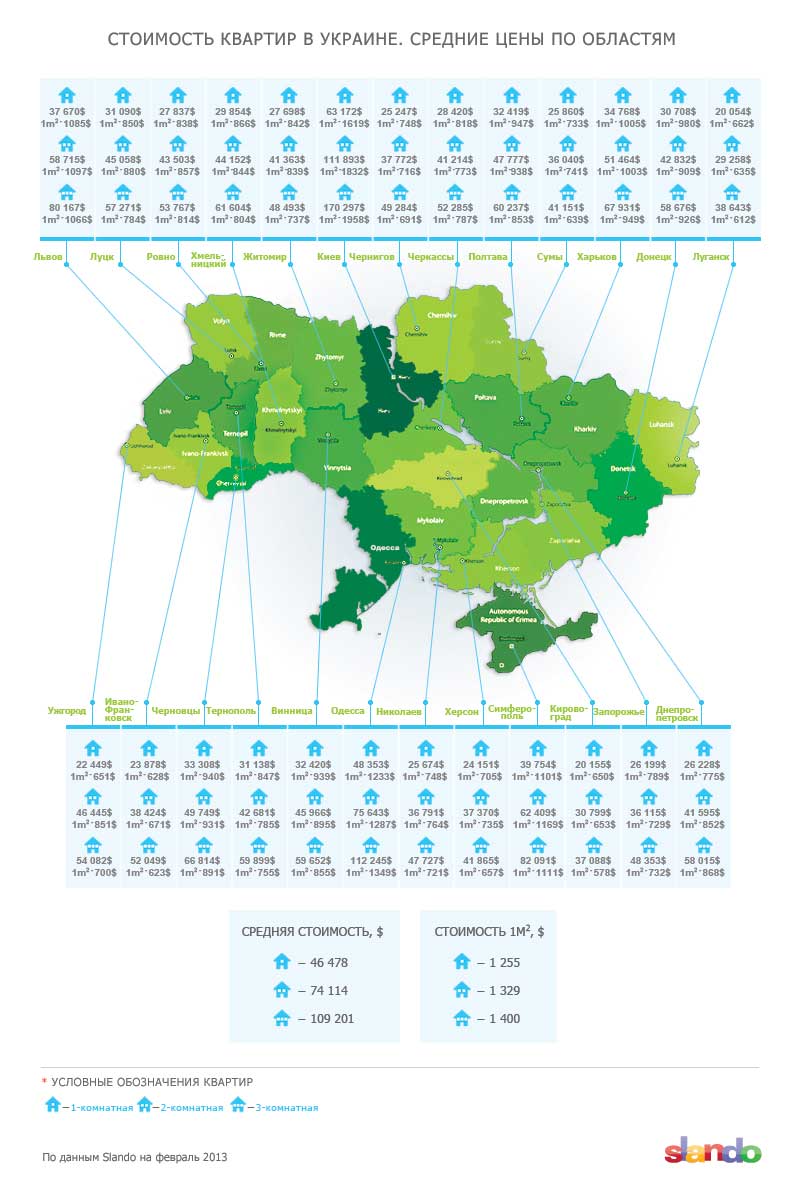 За даними ресурсу, станом на лютий 2013-го року в Україні було близько 440 тис. оголошень про продаж квартир. Їх середня вартість становила:
