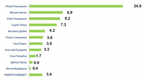 На президентських виборах Петра Порошенка готові підтримати 24,9% опитаних, другу позицію посідає Віталій Кличко – 8,9%, а третю Юлія Тимошенко – 8,2%.