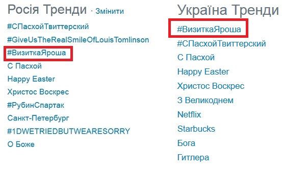 Хештег #визиткаяроша увійшов у тренди російського та українського твіттера, додає Watcher.