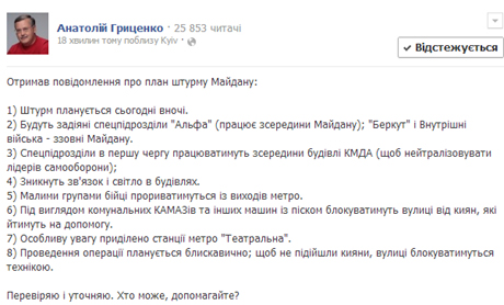 Народний депутат Анатолій Гриценко повідомляє про можливий план штурму Майдану.