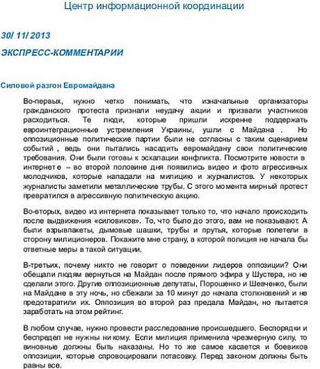 Центр інформаційної координації розіслала провладним чиновникам та депутатам вказівки про те, як потрібно коментувати силовий розгін міліцією мітингу на Майдані Незалежності.