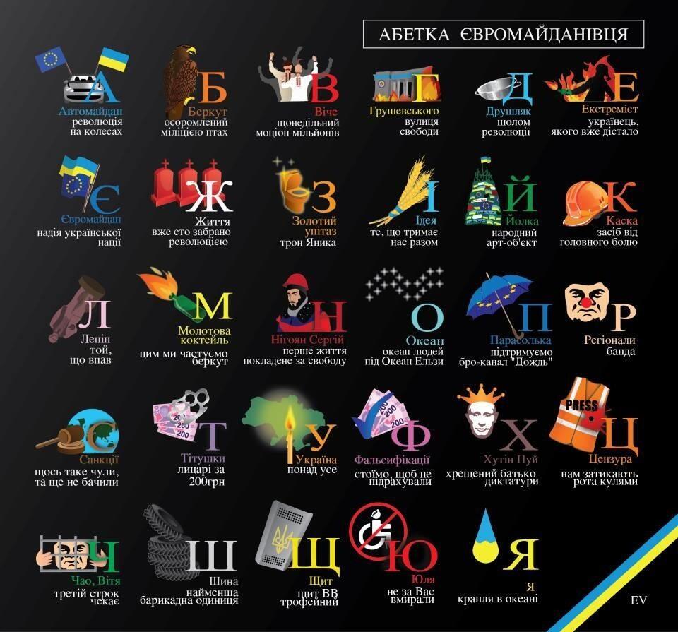 В мережі з’явилася Абетка євромайданівця. У ній на букву М можна побачити «Коктейль Молотова», Е – екстреміста, а на Х – Хутін Пуй.