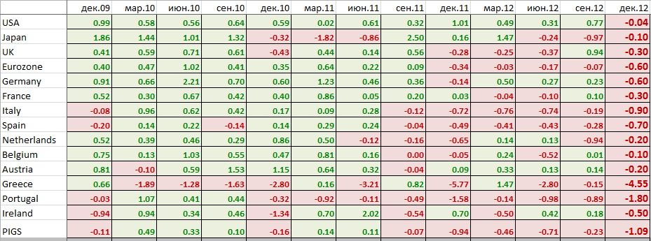 Это динамика квартального реального ВВП после сезонного сглаживания. В данном случае считается, как 4 квартал 2012 по отношению к 3 кварталу 2012 в %. Все страны синхронно вошли в рецессию, причем данные ухудшаются и это однозначно худший квартал с 2009.