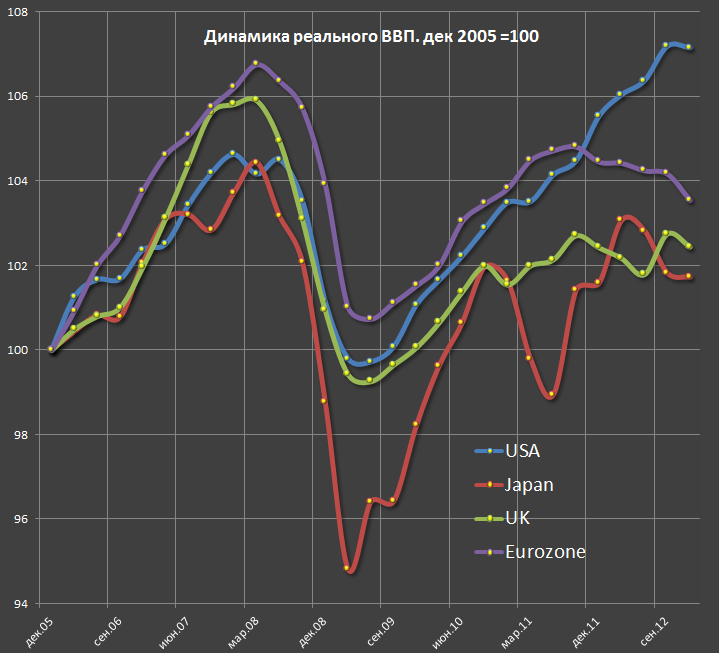 В Европе уже 5 кварталов сокращение ВВП. Англия и Япония в стагнации, но там надо учесть сверх мягкую бюджетную политику. Стоит только порезать расходы правительства, как все сразу рухнет. Всплеск ВВП в Японии в начале 2012 связан с реализации программ по инфраструктурным проектам после землетрясения и аварии на АЭС в марте 2011. Этот эффект сходит на нет уже 3 квартала подряд.