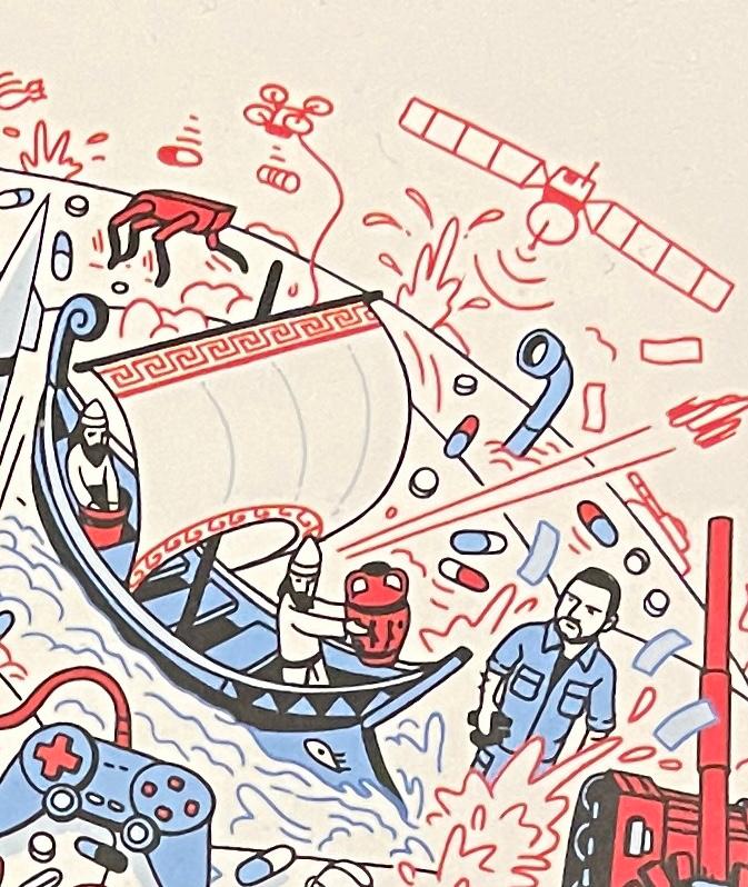 А найцікавішим і найважче тракованим на обкладинці є епізод з парусним човном ліворуч від Зеленського, - чи то грецьким, чи то варязьким.