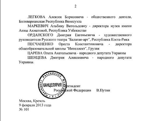 Так, згідно з указом Путіна, до нагороди представлені автори скандального "мовного" закону Сергій Ківалов і Вадим Колесніченко та їхні колеги з фракції Партії регіонів - Олег Царьов і Дмитро Шенцев, а також колишній депутат від цієї фракції заступник голови громадської організації «Шлях православних» Юрій Болдирєв, пишуть "Коментарі".