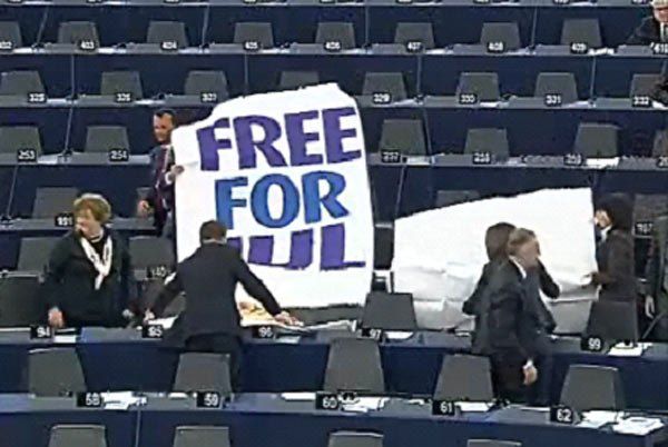 У Європейському парламенті проходять дебати щодо ситуації в Україні, під час яких депутати розтягнули плакат з написом Freedom for Yulia (Свободу Юлії) із портретом колишнього прем‘єр-міністра України.