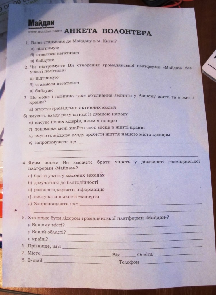 Хлопець, який представився Михайлом, нічого не пояснив. Сказав лише, що працює волонтером, гроші за свою роботу не отримує. Втім, зізнався, що деякі анкетні дані він видумав. Замовників опитування молодий чоловік не назвав. Відтак попросився вийти в туалет і зник. "Волонтер" залишив всі заповнені і незаповнені анкети та накидку, в якій працював.