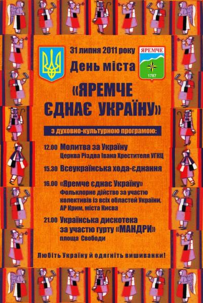 У програмі святкувань: молитва за Україну, Всеукраїнська хода-єднання, фольклорний фестиваль та "українська дискотека" за участі гурту "МАНДРИ".
