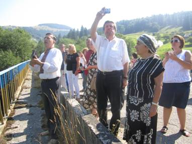 Іван Михайлович зосередив увагу присутніх на капличці, що знаходиться під мостом і з’єднує дві гори Буківця: саме біля неї було знято кадри фільму, де Марічка тримала на руках ягня. Наступна зупинка - підніжжя урочища Запідок в с.Верхній Ясенів, де знімався фрагмент падіння смереки на Олексу. Далі - церква с. Криворівня, хата-гражда, які є у фільмі «Тіні забутих предків», музей Івана Франка та музей Михайла Грушевського.