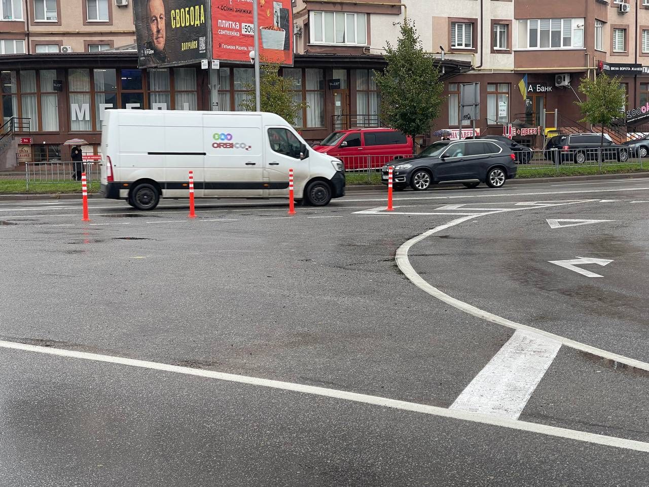 Як вказує посадовець, тепер водії не зможуть повертати ліворуч там, де заборонено, та перетинати подвійну лінію розмітки при заїзді до торгового центру. Делініатори також унеможливлюють розворот перед острівцем безпеки.