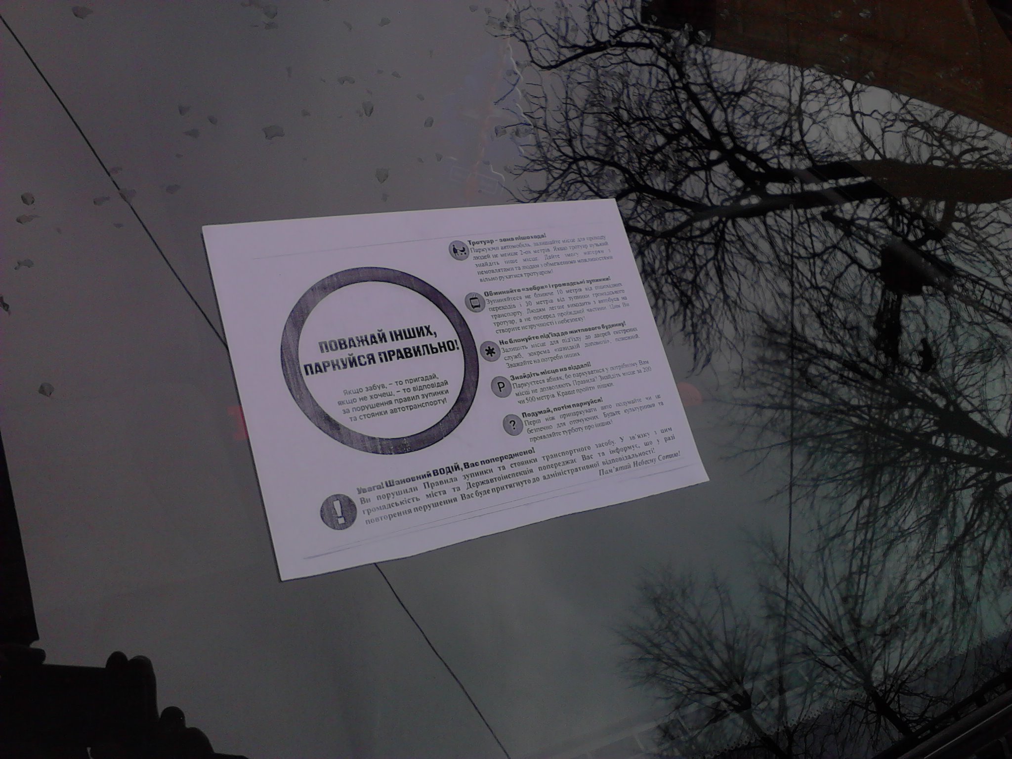 Наліпки з нагадуванням про недопустимість порушень правил дорожнього руху активісти наклеюють на лобове скло і як правило без дозволу водіїв. Перші такі випадки Версії зафіксували на вулиці Січових стрільців, де водії паркуються порушуючи вимоги дорожнього знаку 3.34 ПДР "Зупинка заборонена" (розташоваваного на початку згаданої вулиці зі сторони вул. Незалежності), пишуть Версії.