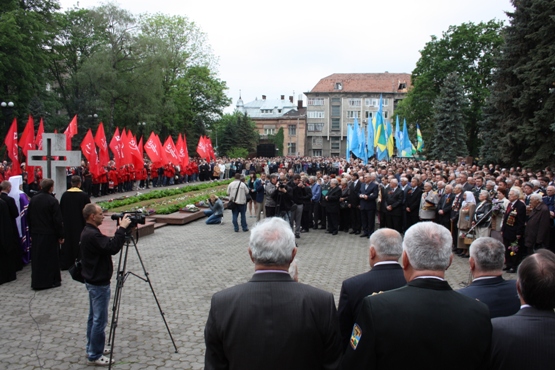 У Меморіальному сквері по вул. Богдана Лепкого зібралися усі небайдужі до минулого України – ветерани, діти війни, прості перехожі несли до пам’ятного знаку гілки бузку, гвоздики і тюльпани.