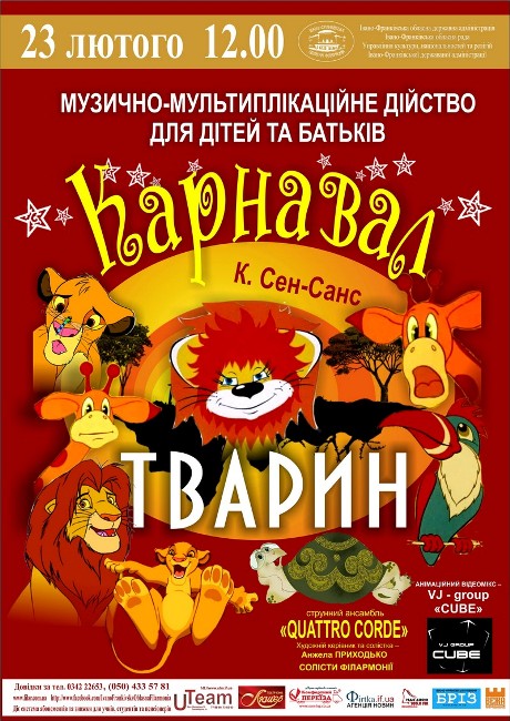 У суботу, 23 лютого о 12.00 в Івано-Франківській обласній філармонії відбудеться музично-мультиплікаційне дійство для дітей та батьків «Карнавал тварин».