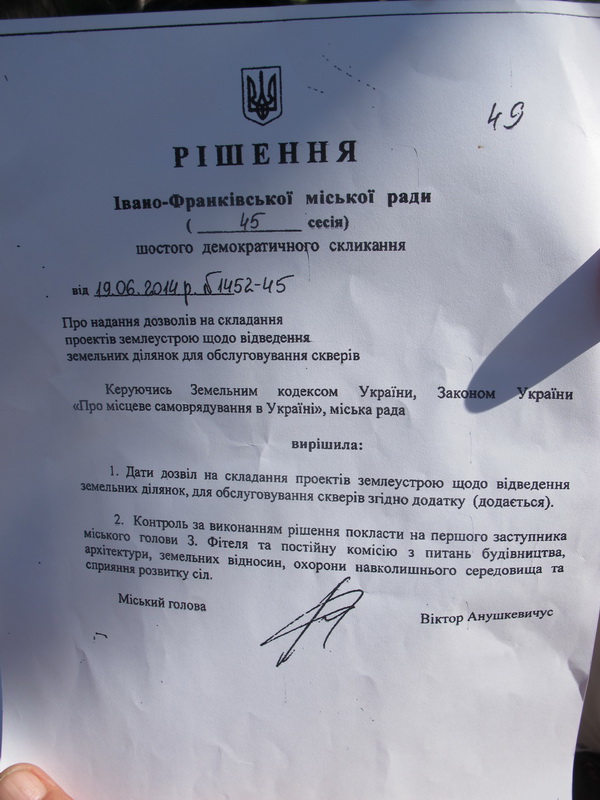 Сьогодні, 30 червня, на зустріч із громадою прийшов секретар міської ради Микола Вітенко. Приніс людям дозвіл міської ради на облагородження прилеглої території на сквер, запевнив, що жодного будівництва тут також проводити не будуть.