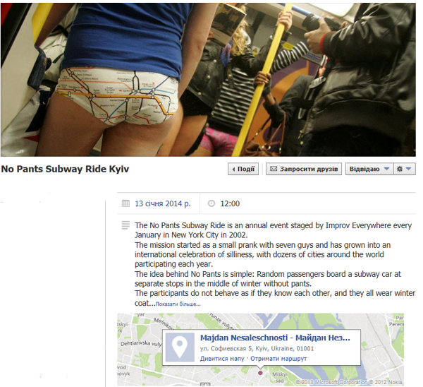 Дата проведення акції – 13 січня 2014 року о 12 годині, ідея акції проста – пасажири сідають в метро взимку без штанів.
