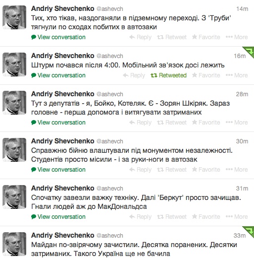 "Майдан по-звірячому зачистили. Десятка поранених. Десятки затриманих. Такого Україна ще не бачила" , пише депутат Андрій Шевченко у своєму твітері.