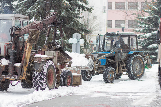 На площі перед будинком облдержадміністрації працює важка техніка: два трактори та кілька вантажівок. Сніг вивозять за межі міста.